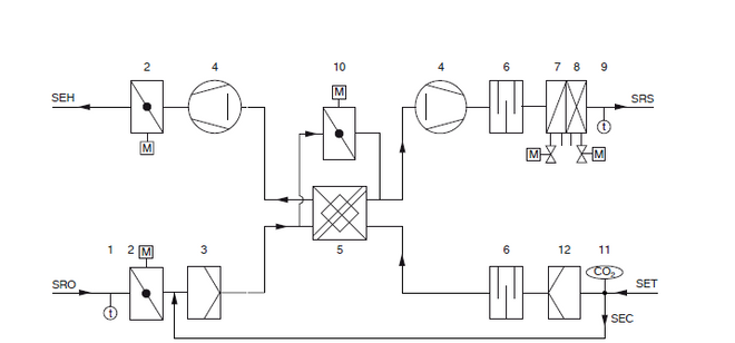 Decentralised supply and extract air units ventilate the room and cover the cooling and heating load in accordance with the technical data. An EC centrifugal fan takes in the outdoor air which then flows through the motorised shut-off damper and the outdoor air filter. Then the outdoor air flows through the crosscounterflow heat recovery unit, which can be bypassed in energetically sensible operating situations and for unit protection. If necessary, the air is heated or cooled by the heat exchanger before it is supplied into the room as a displacement flow. The extract air first passes through the extract air filter, then flows through the heat recovery unit, the extract air fan and the motorised shut-off damper before it is discharged to the outside as exhaust air. If the indoor air quality is sufficient, the FSLCONTROL III control system switches to energy-efficient secondary air mode by closing the outdoor air dampers. The control system compares the room air quality setpoint value to the actual value measured by the CO2 sensor and switches automatically between outdoor air and secondary air operation. In case of a power failure, the outdoor air and exhaust air dampers are closed to ensure fire protection, frost protection and to avoid draughts. This is ensured by a capacitor in each actuator.Near the external wall, the supply air is discharged into the room with a medium velocity between 0.5 and 0.8 m/s. Due to the induction effect, the supply air velocity is rapidly reduced after entering the room. As a result, in cooling mode, the supply air spreads out like displacement flow over the entire floor area. Near heat sources such as people or equipment, a lift current is formed by natural convection, so that the air is exchanged primarily in these areas.