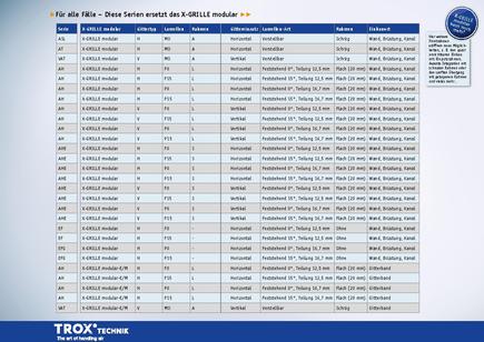 Las demostradas prestaciones técnicas de las rejillas de ventilación de TROX se conservan, ampliando el número de variantes posibles. Consulte el documento con las equivalencias de las nuevas X-GRILLE modular.