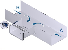 La presión efectiva, es decisiva para el cálculo del caudal de aire, se registra y mide en la lama de la compuerta de regulación. Por lo tanto, la precisión de medición del caudal de aire Δqv es independiente de la longitud del tramo antes de la unidad, pero en el caso de uniones desde el conducto principal, dependerá de la variante de control seleccionada.